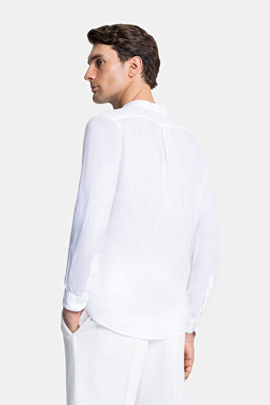 Keten kumaştan üretilen beyaz renkli Vakko spor gömlek, düğme kapamalıdır.