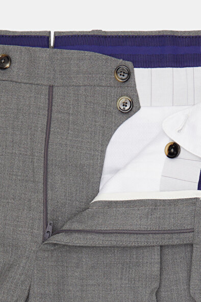Yan ve arka ceplere sahip olan Vakko pantolon, gri melanj renktir. Bu model, yeni yün ve ipek kumaştan üretilmiştir.