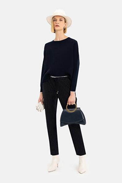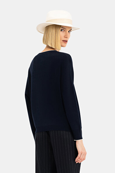 Akrilik, modal kumaştan üretilen Vakko triko, lacivert renktir. Bu tasarım, kontrast renkte biyeli O yaka detayına sahiptir.